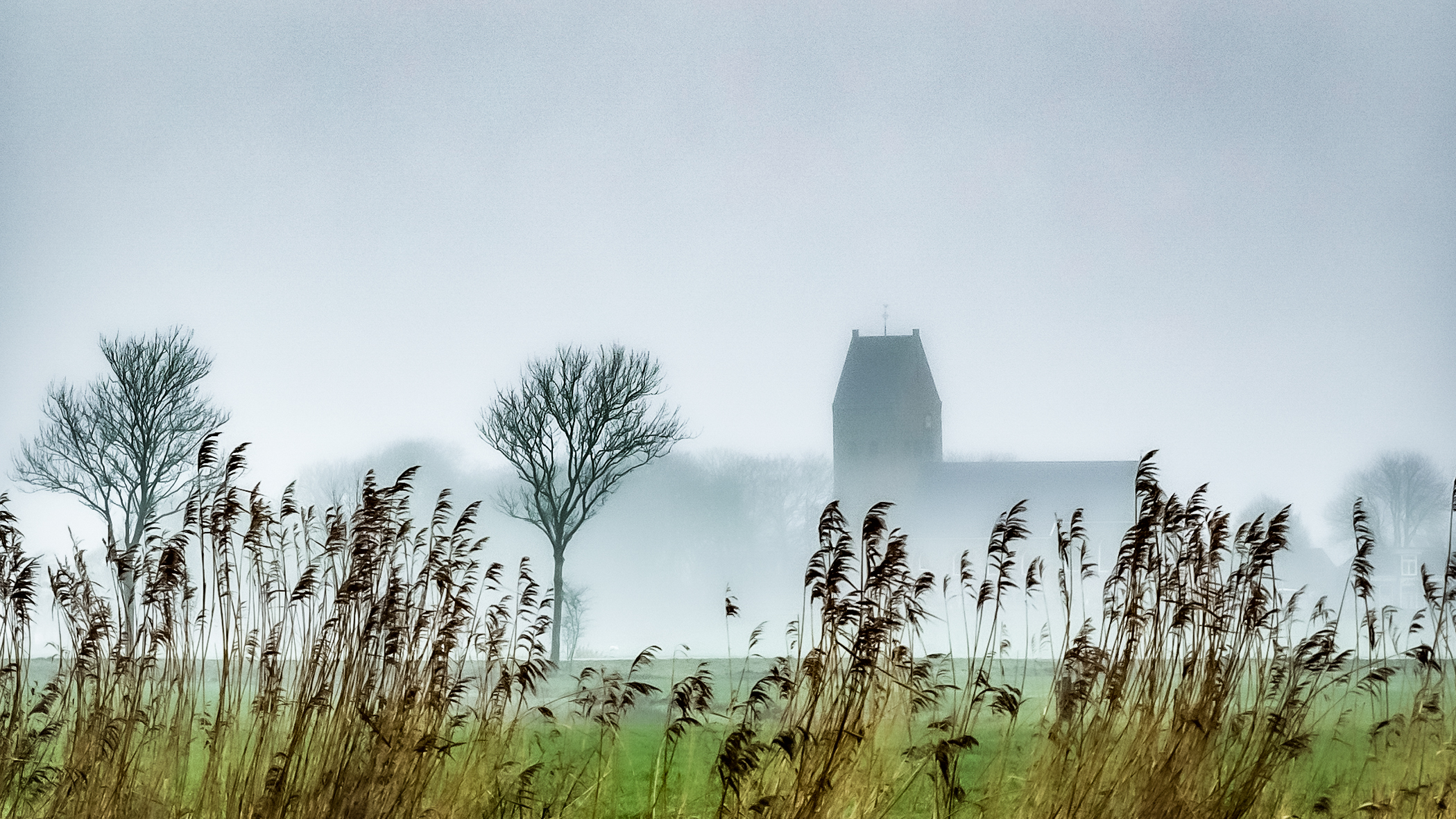 Kerkje van Wanswerd (Frl.), in ochtendmist