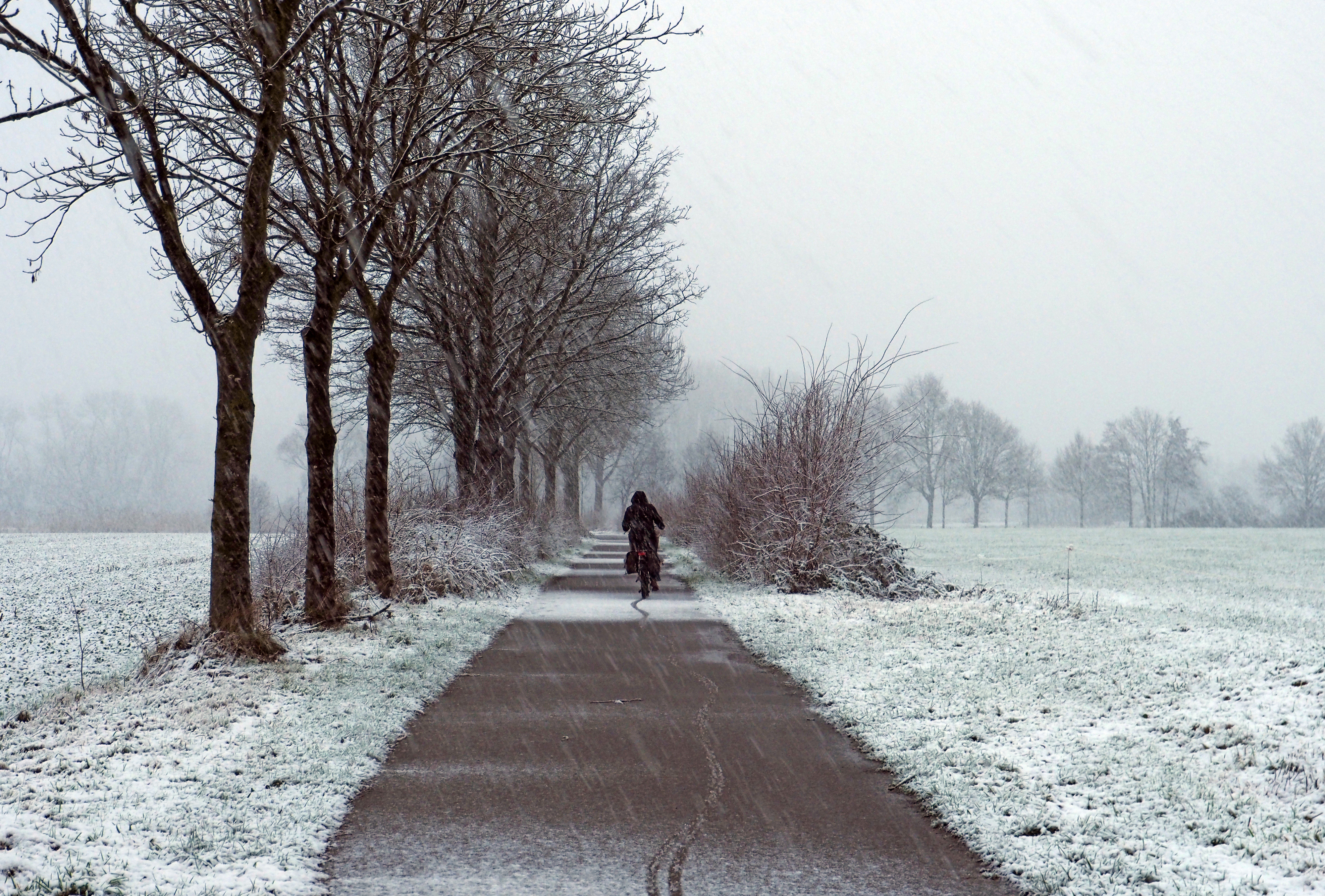 Winterplaatje fietser heeft moeilijk mee.