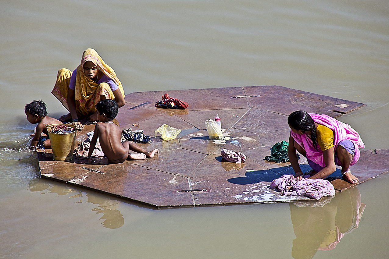 Twee vrouwen doen hun wasje op een net drooggevallen plateau in de Ganges rivier. Ik heb hier een serie van gemaakt hoe dit plateau een rol speelt in het dagelijks leven.Tijdens de Moesson staat hij onder water, maar daarna valt hij droog en wordt intensief gebruikt