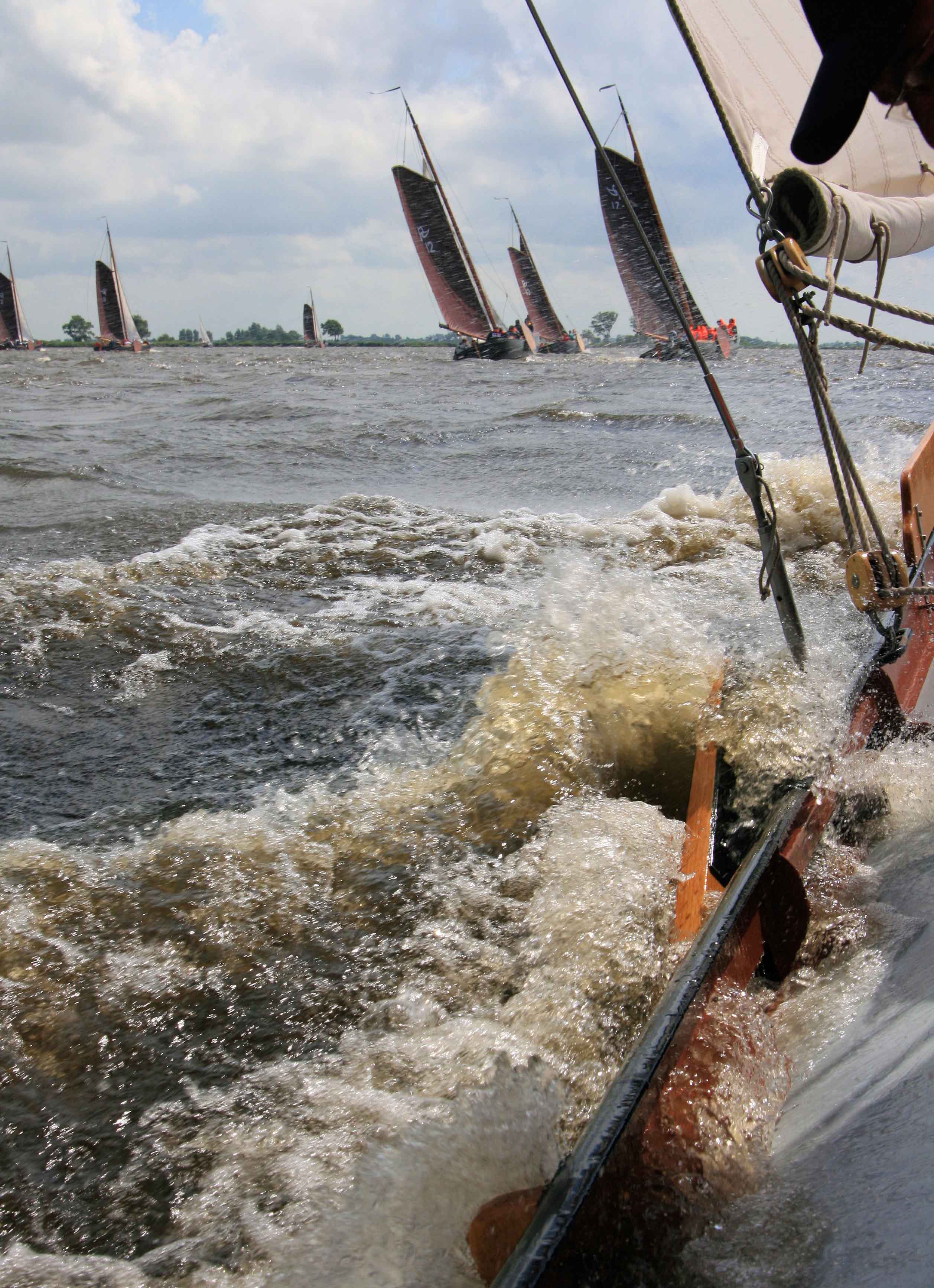 Windkracht 7. Het water in de gangboorden tijdens een zeilwedstrijd van pramen op het Sneekermeer.
