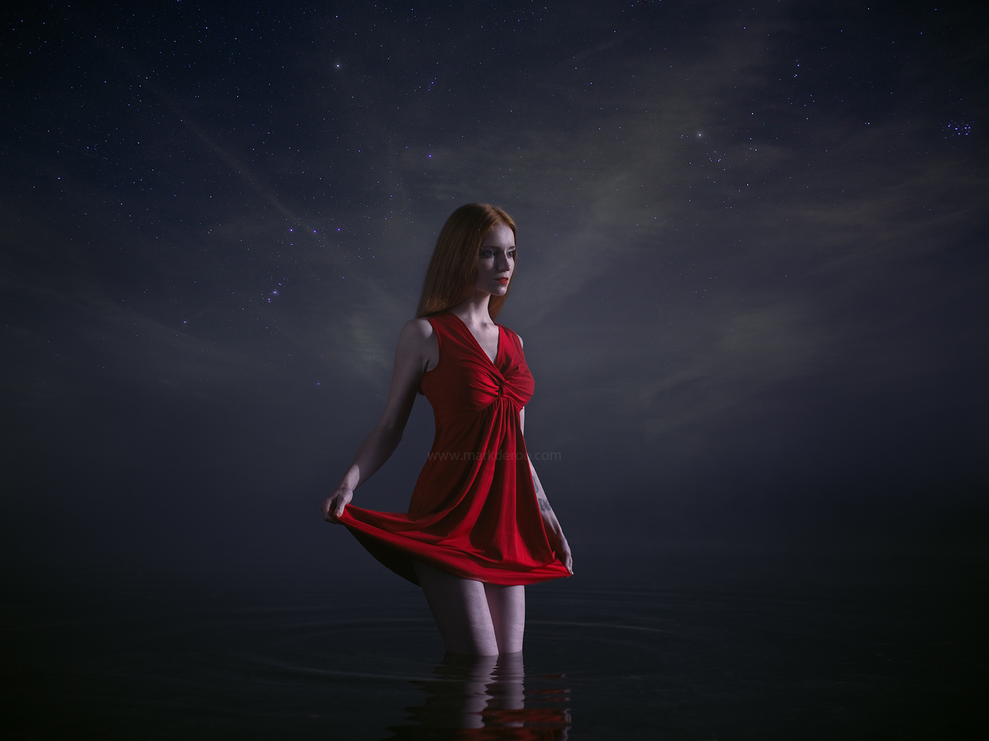 Onlangs zijn we bij duisternis op locatie in het water gaan fotograferen! Samen met m'n flitsers, en natuurlijk de mistmachine heb ik samen met m'n team dit beeld neer gezet. De mistmachine maakt een ontzettend mooie overgang tussen water, horizon en de lucht!