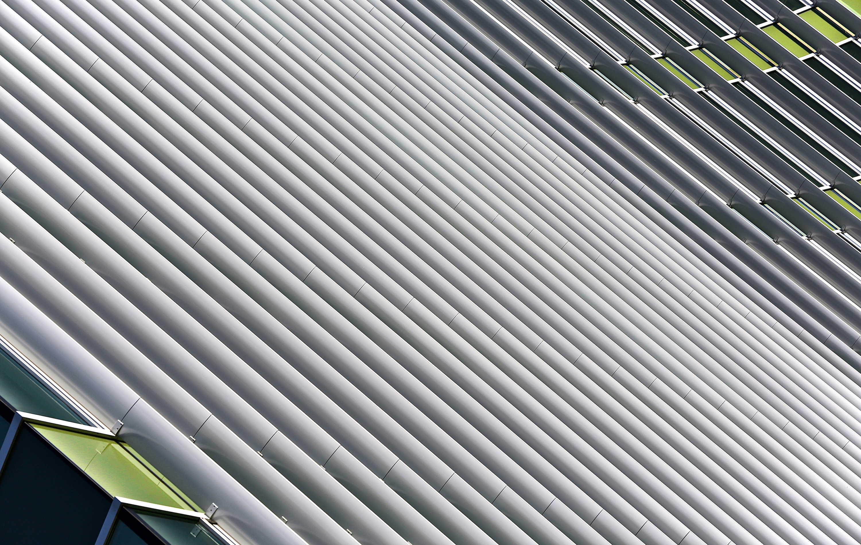 Een abstract fragment van een moderne vliesgevel met lamellen.