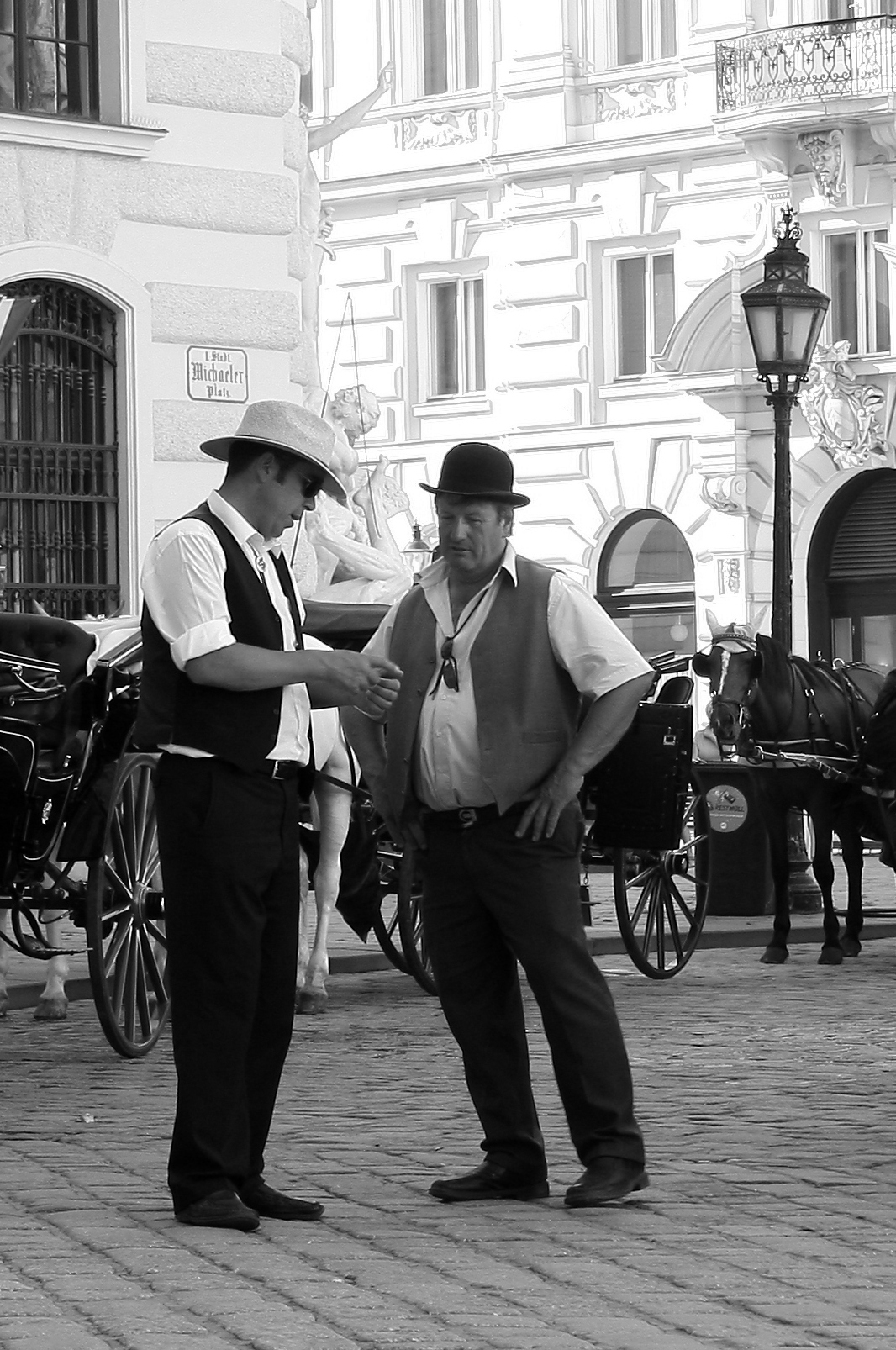 Koetsiers voeren overleg op de Michaelerplatz in Wenen.