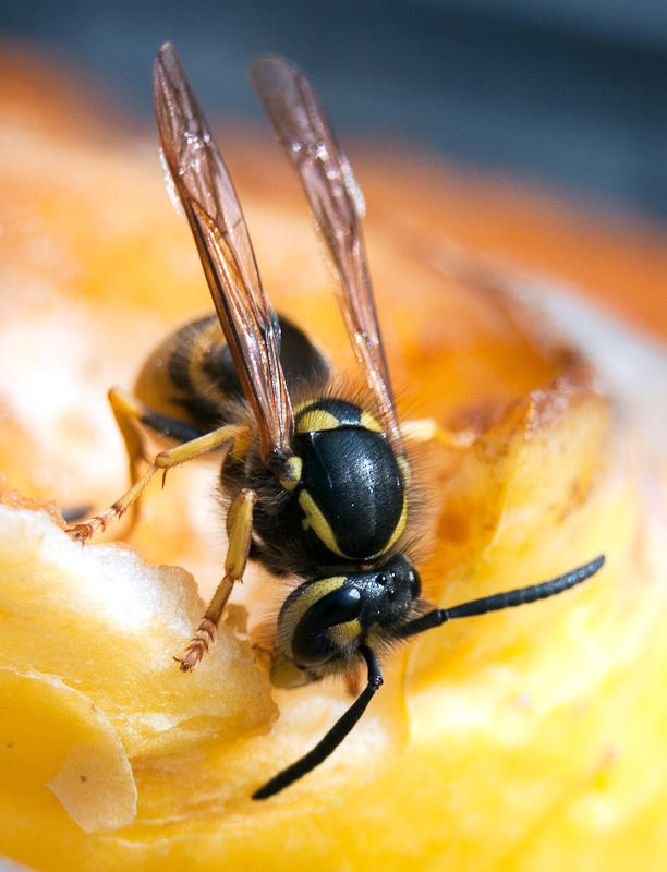Deze wesp is lekker een appeltje aan het eten.