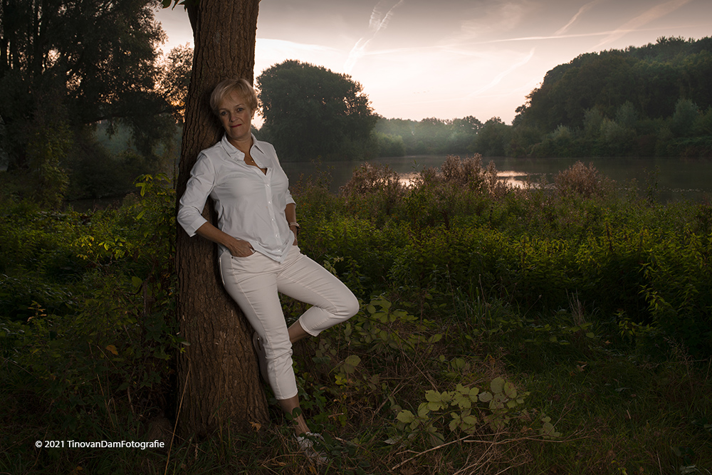 Voor dit total shot een striplight gebruikt. De witte kleding maakt, dat het model direct de blijkvanger is. Ik vind het altijd een meerwaarde hebben wanneer je op locatie met flitslicht werkt. Deze foto is met heel veel tegenlicht genomen, vroeg in de ochtend vlak voor dat de zon op kwam.