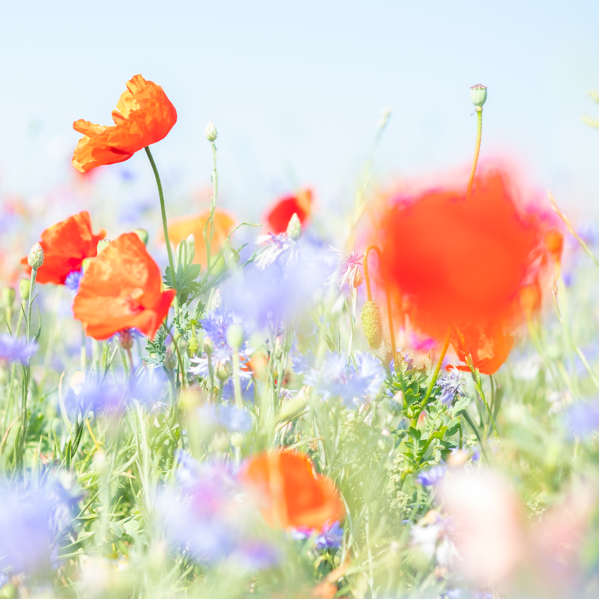 Klaprozen en korenbloemen met een macrolens gefotografeerd