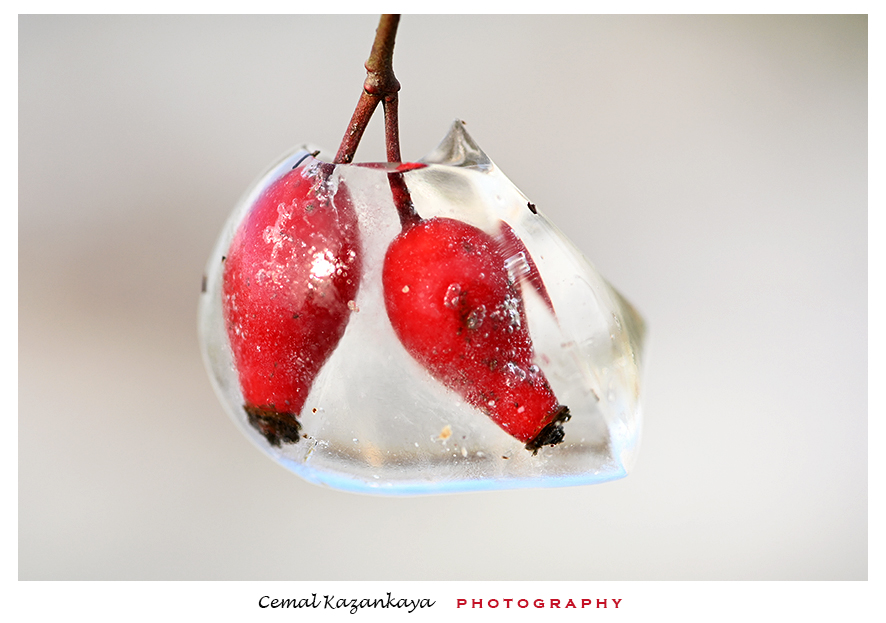 Wilde rode rozenbottels bedekt met ijs..