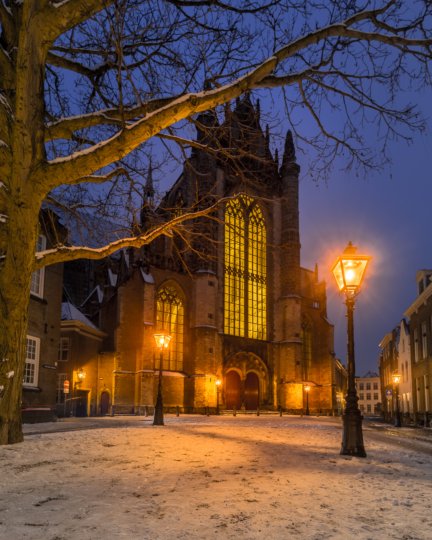Een klassiek Dickensiaans beeld van de Hooglandse Kerk in Leiden.