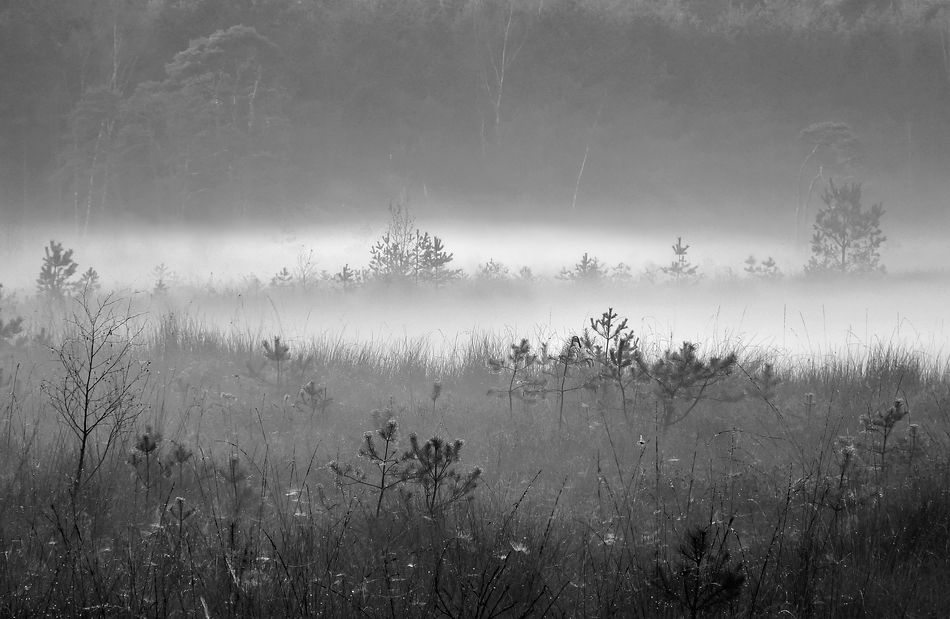 Flarden laaghangende mist. In zwart wit omgezet.
