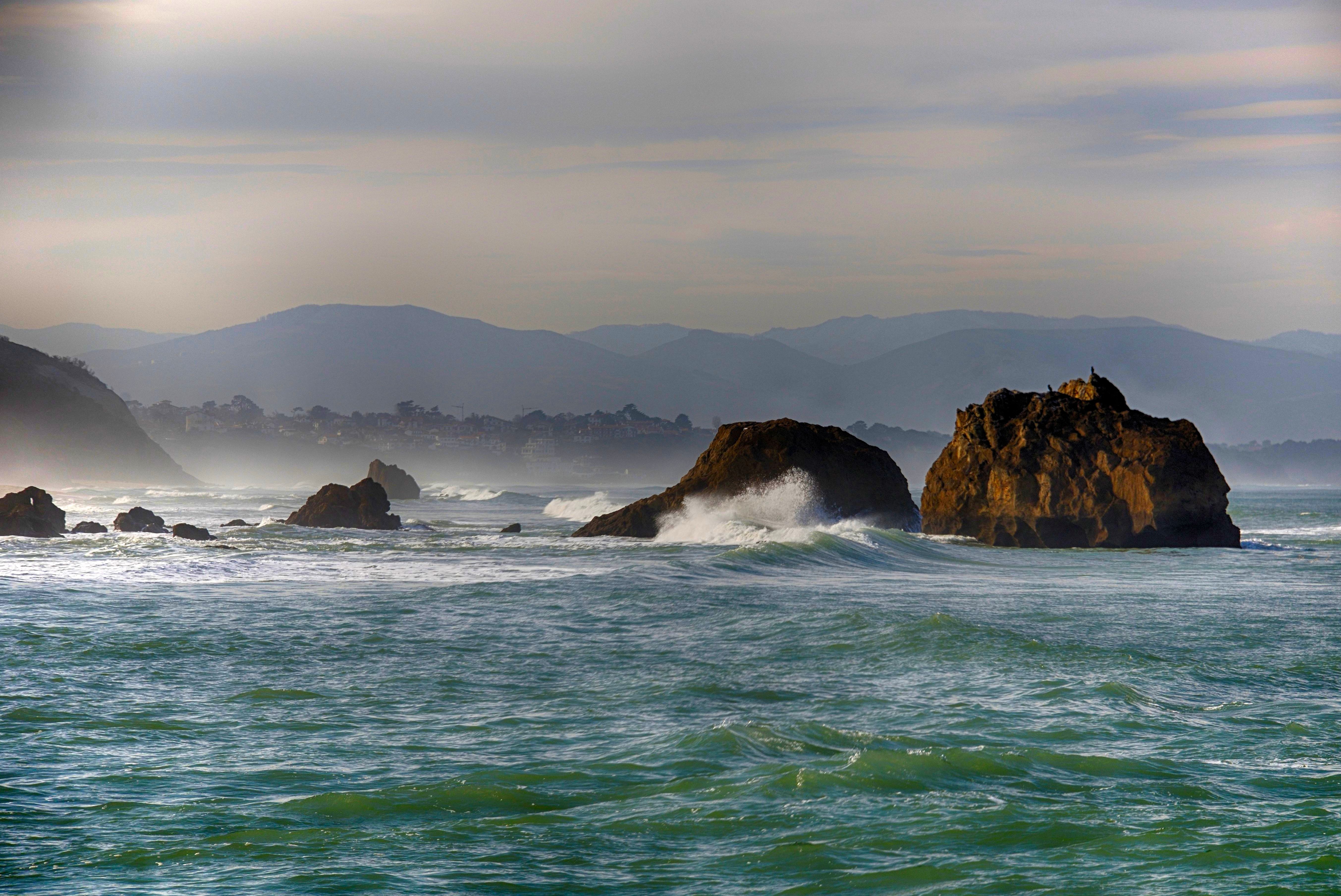 Woeste zee in de Golf van Biskaje. Foto is genomen aan de kust bij Biarritz, de bergen in de achtergrond liggen in Spanje.
