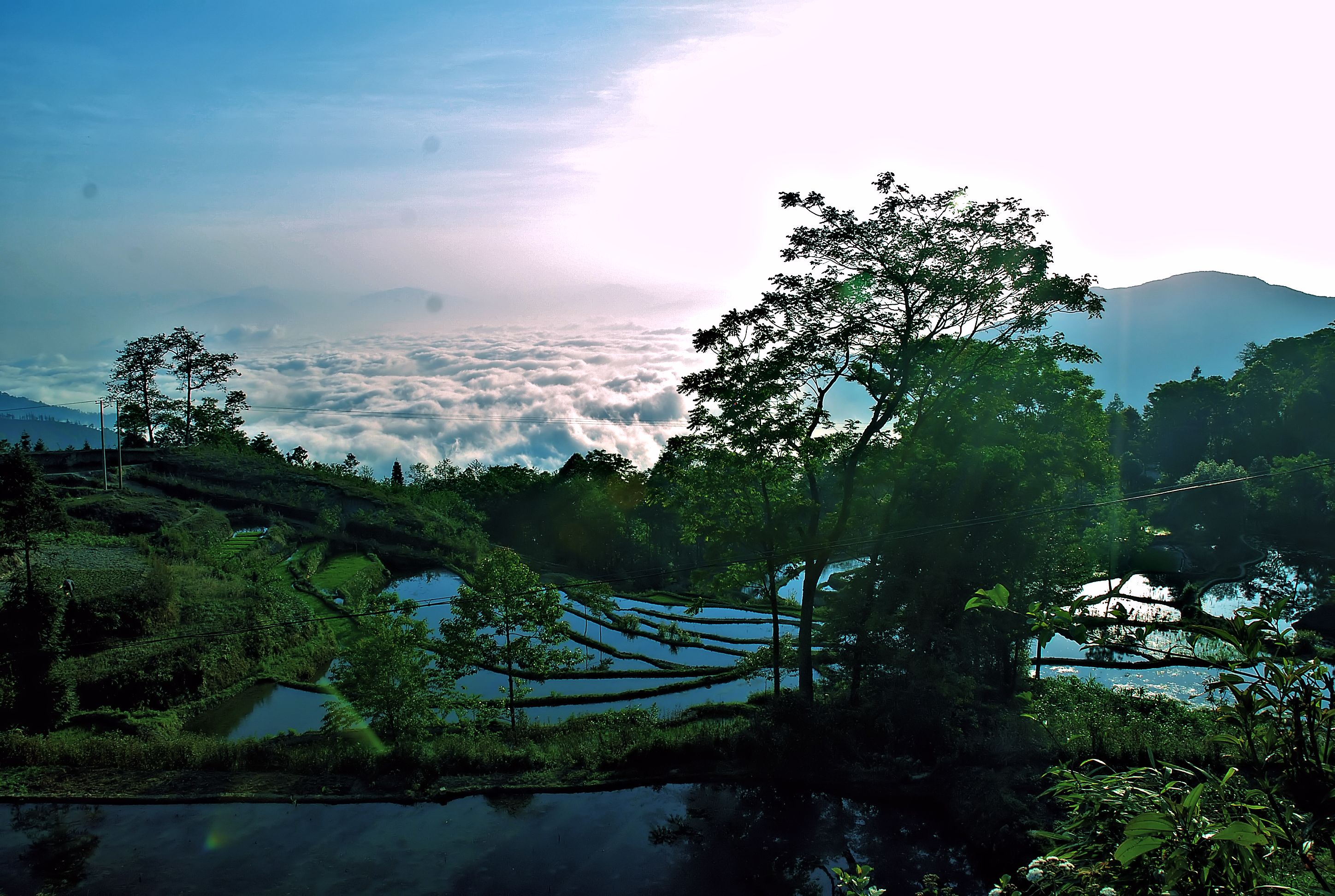 rijstvelden met een wolkendek in het dal