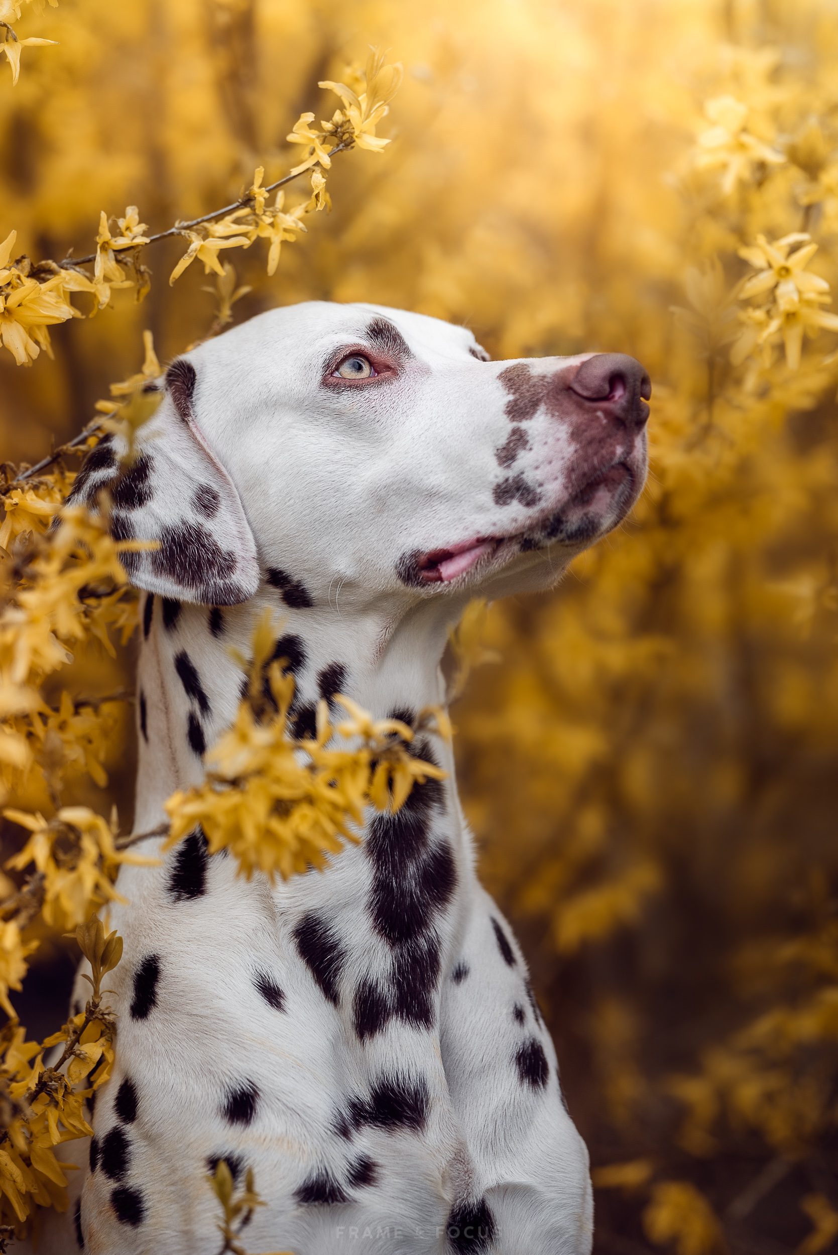 Dalmatiër in de Forsythia's.