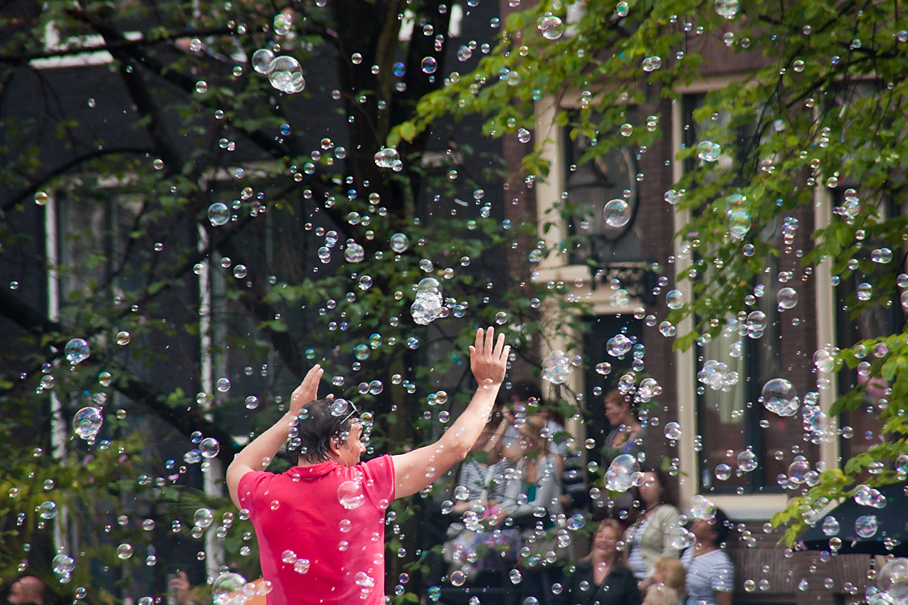 Een deelnemer aan de Canal Gay parade in Amsterdam omgeven door zeepbelletjes.Vooral geopend een schitterend gezicht