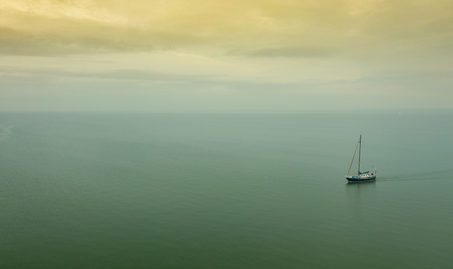 Een dronefoto van een zeilboot die richting een haven gaat langs het IJsselmeer. Licht was prachtig evenals de kleuren die van het water overgaat in de lucht.