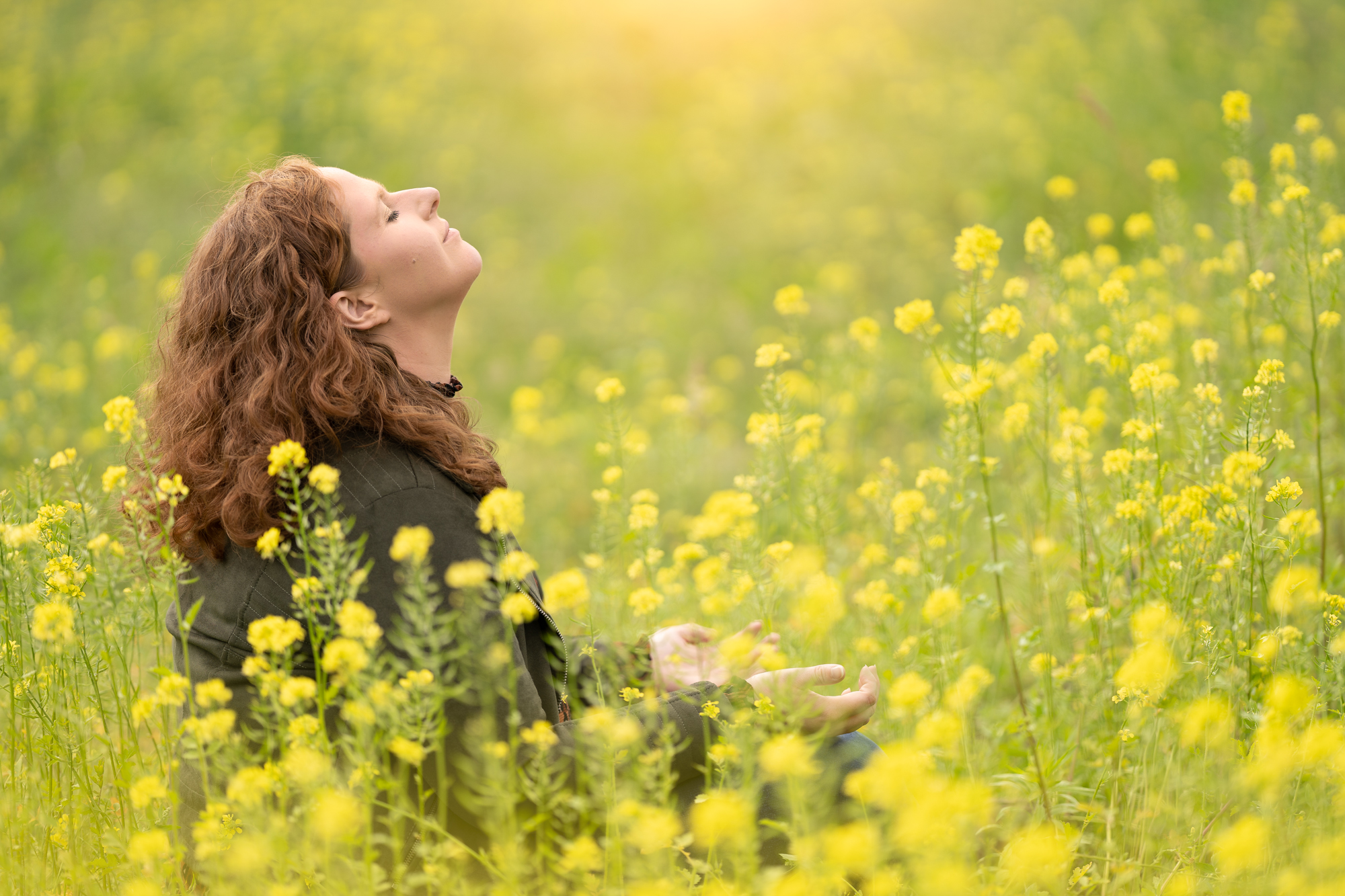 Zomerse fotoshoot in een veld met raapzaad.