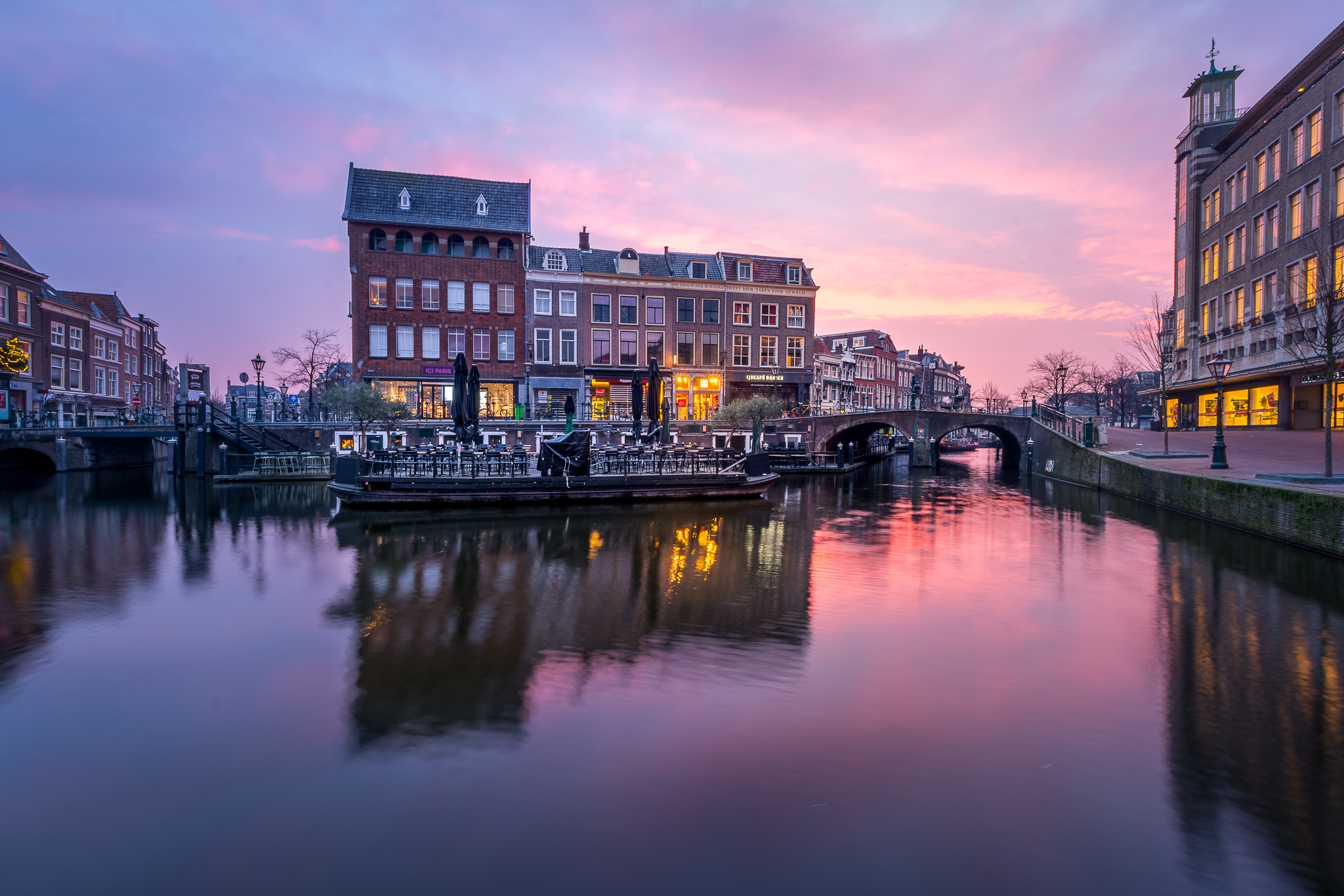 Een stadsgezicht van de binnenstad van Leiden. Rechts Hudsons Bay en rechtdoor het drijvende terras van Annie's Verjaardag.