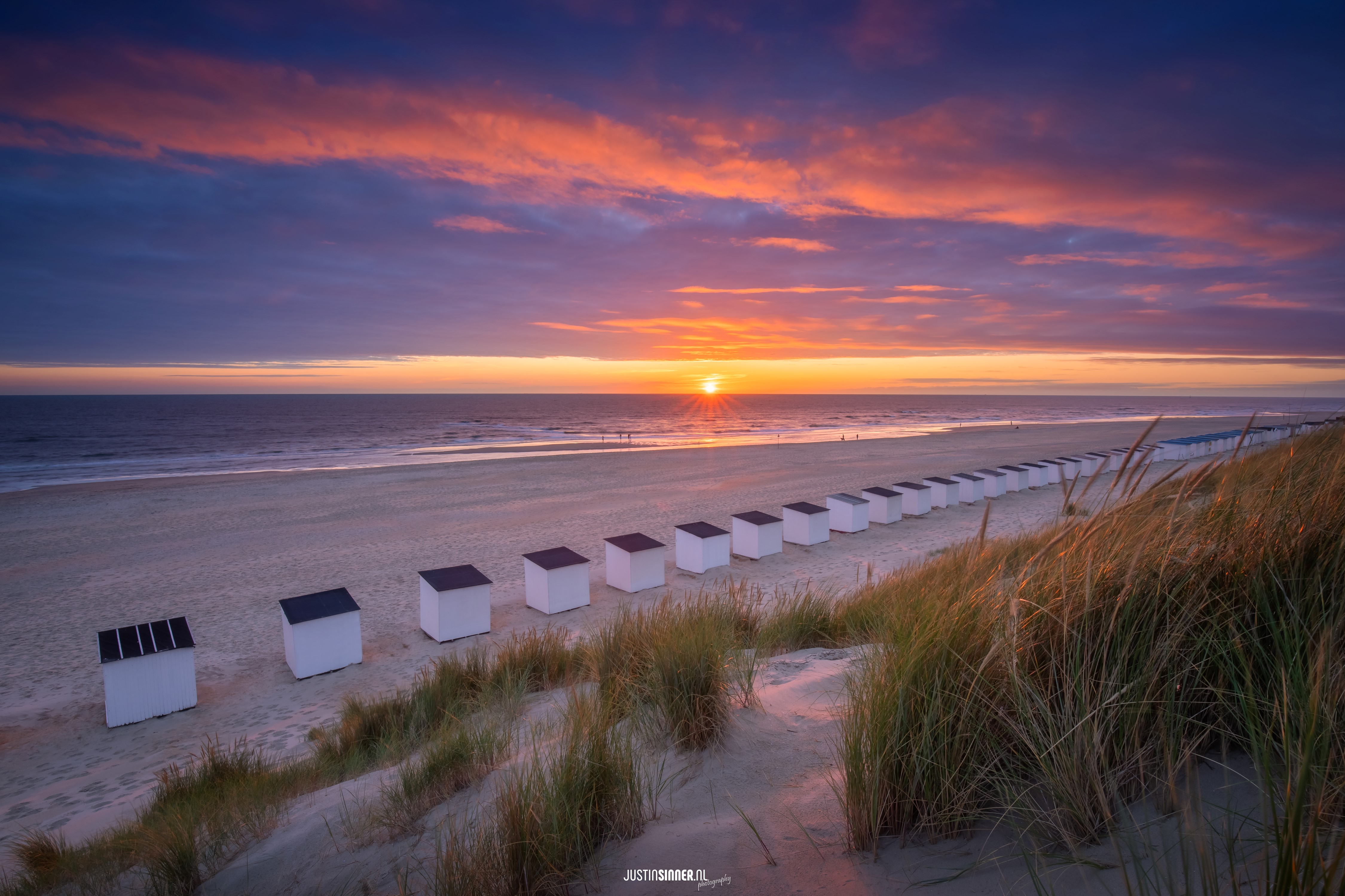 Zomer op Texel. Mooie luchten en rijen met strandhuisjes. #Texel #strand #strandhuisjes #zonsondergang #justinsinnerphotography #waddeneiland