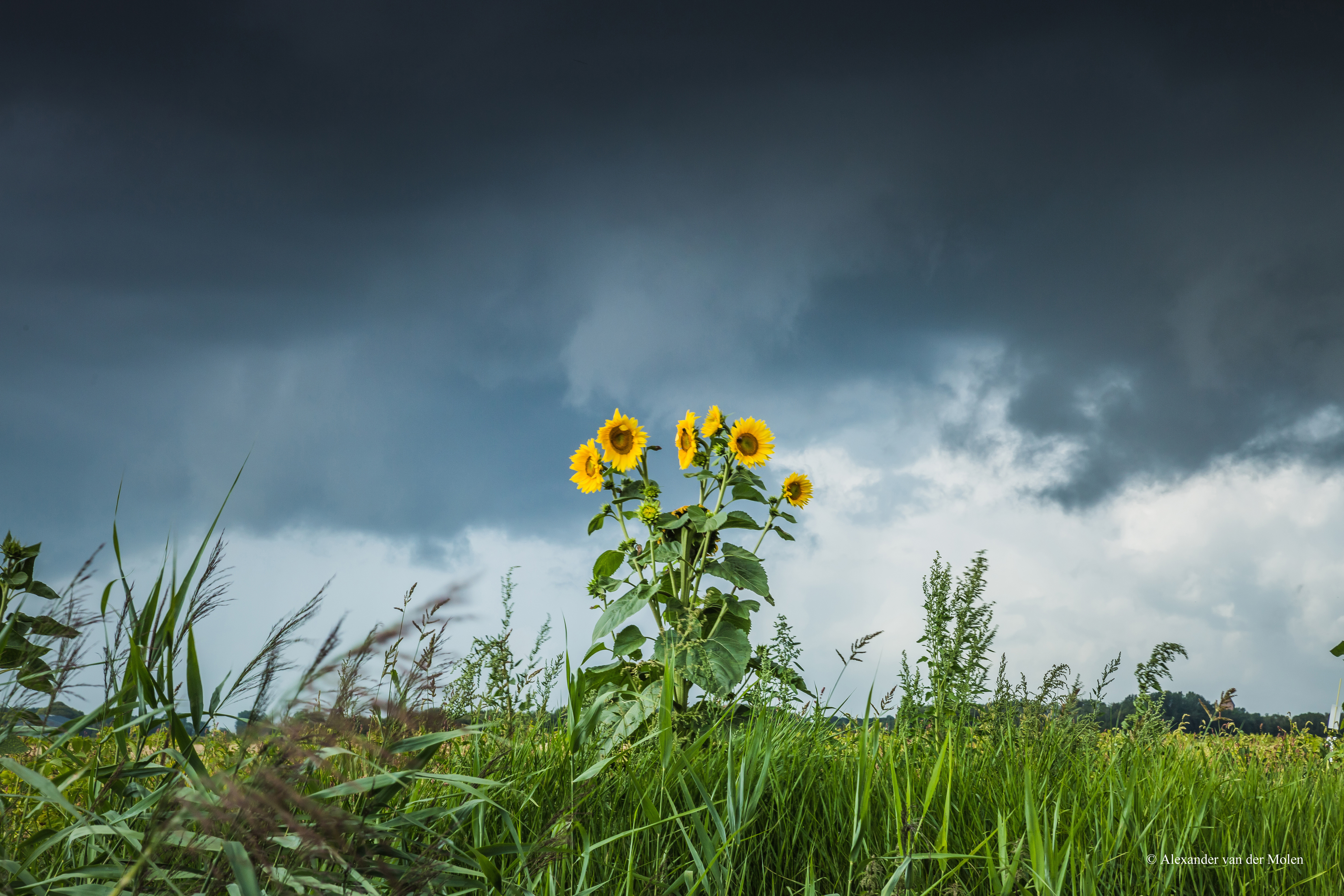Zonnebloemen tegen regenlucht