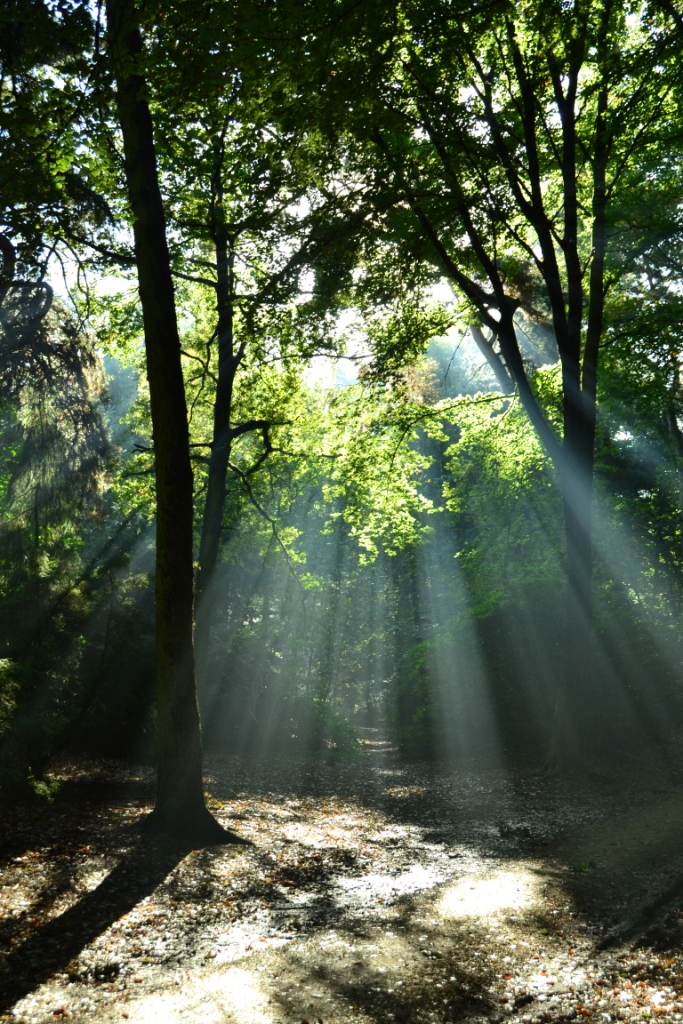 Zonnestralen door de bomen