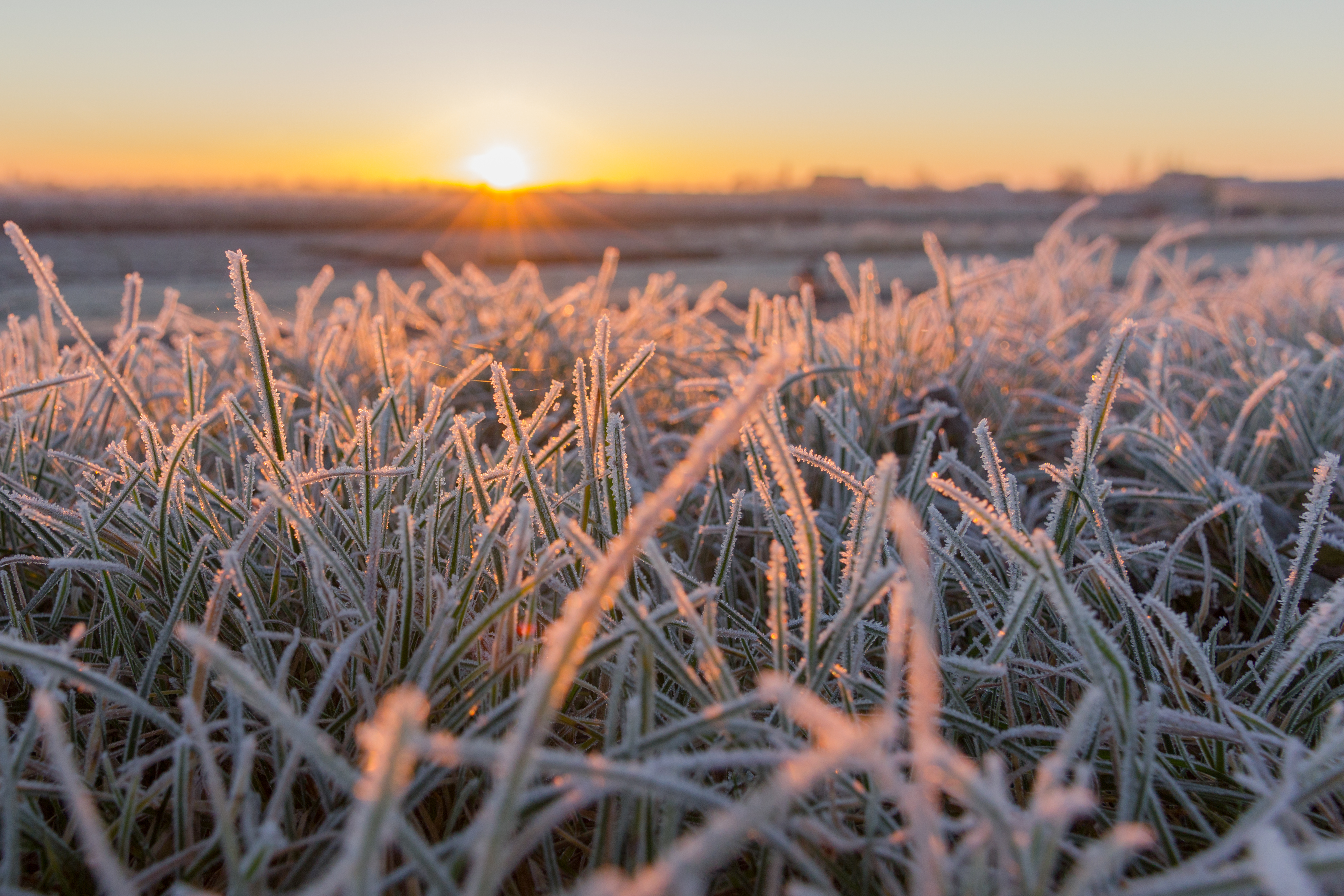 Deze foto heb ik in de vroege koude ochtend gemaakt de zon was net op. Heb hem laag van de grond genomen zodat je nog mooi de bevroren grassprieten kon zien.