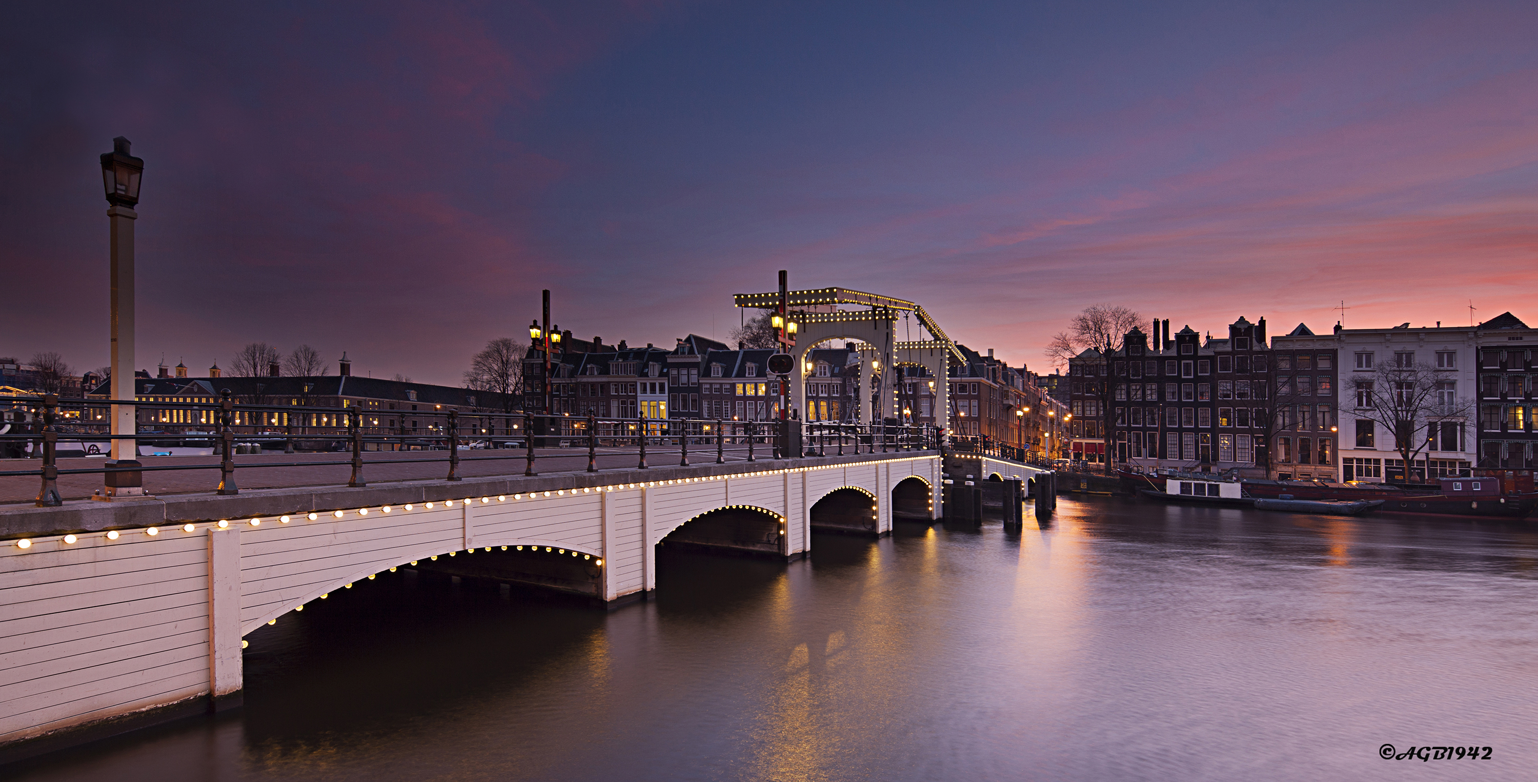 De zon gaat onder boven de Magere Brug in Amsterdam.