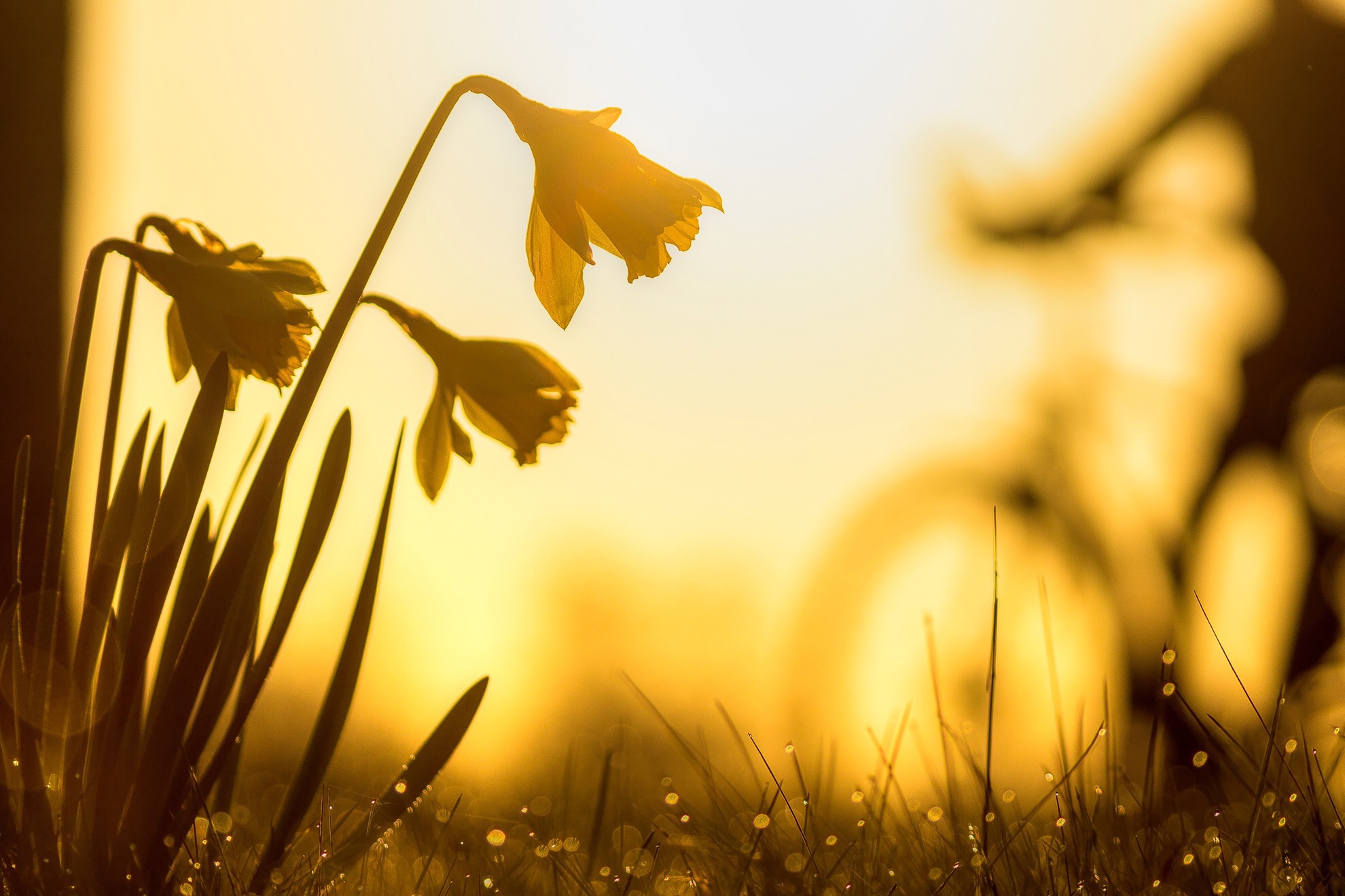 Net op het moment dat ik een voorjaarsfoto wilde maken van de zonsopkomst in combinatie met de narcissen, kwam er een jongen op de fiets langs rijden. Waarschijnlijk was hij op weg naar school. Aanvankelijk dacht ik dat de foto mislukt was. Echter, bleek niets minder waar te zijn.