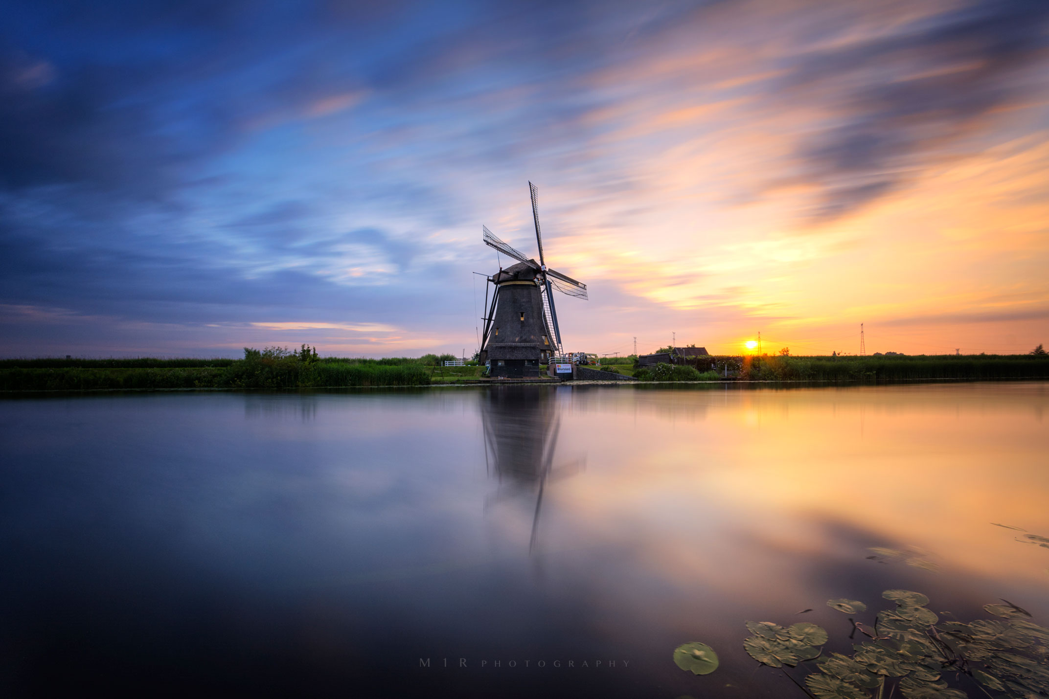 Kinderdijk tijdens opkomst van de zon rond de klok van 5.44