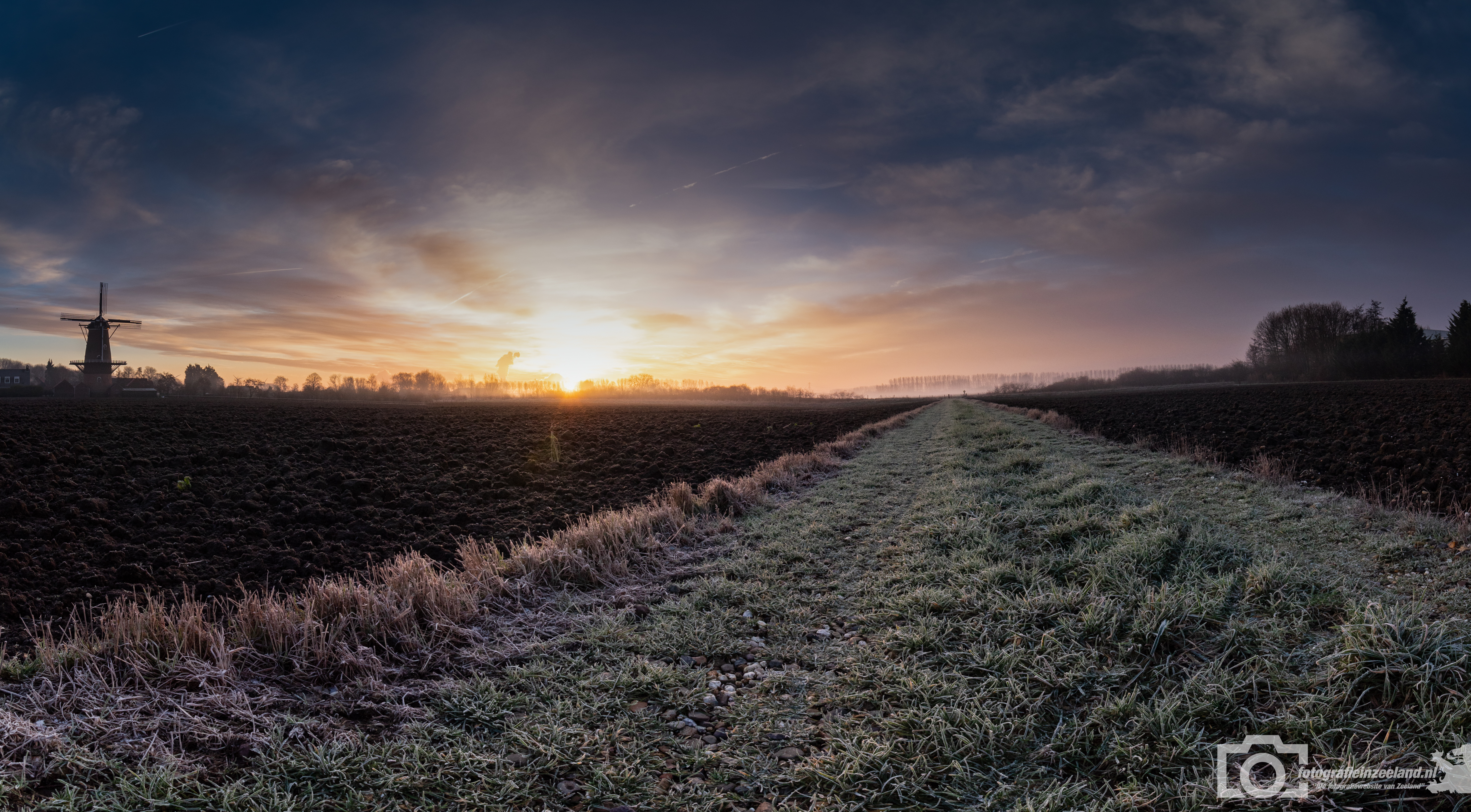De zonsopkomst van 18 januari 2019, rond de klok van 9 uur. Het was een mooie zonsopkomst met laaghangende mist en rijp op het gras. Ik heb zo'n laag mogelijk standpunt gekozen en gebruik gemaakt van een groothoeklens
