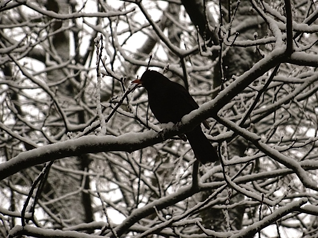 Zwarte merel koestert de witte wereld!