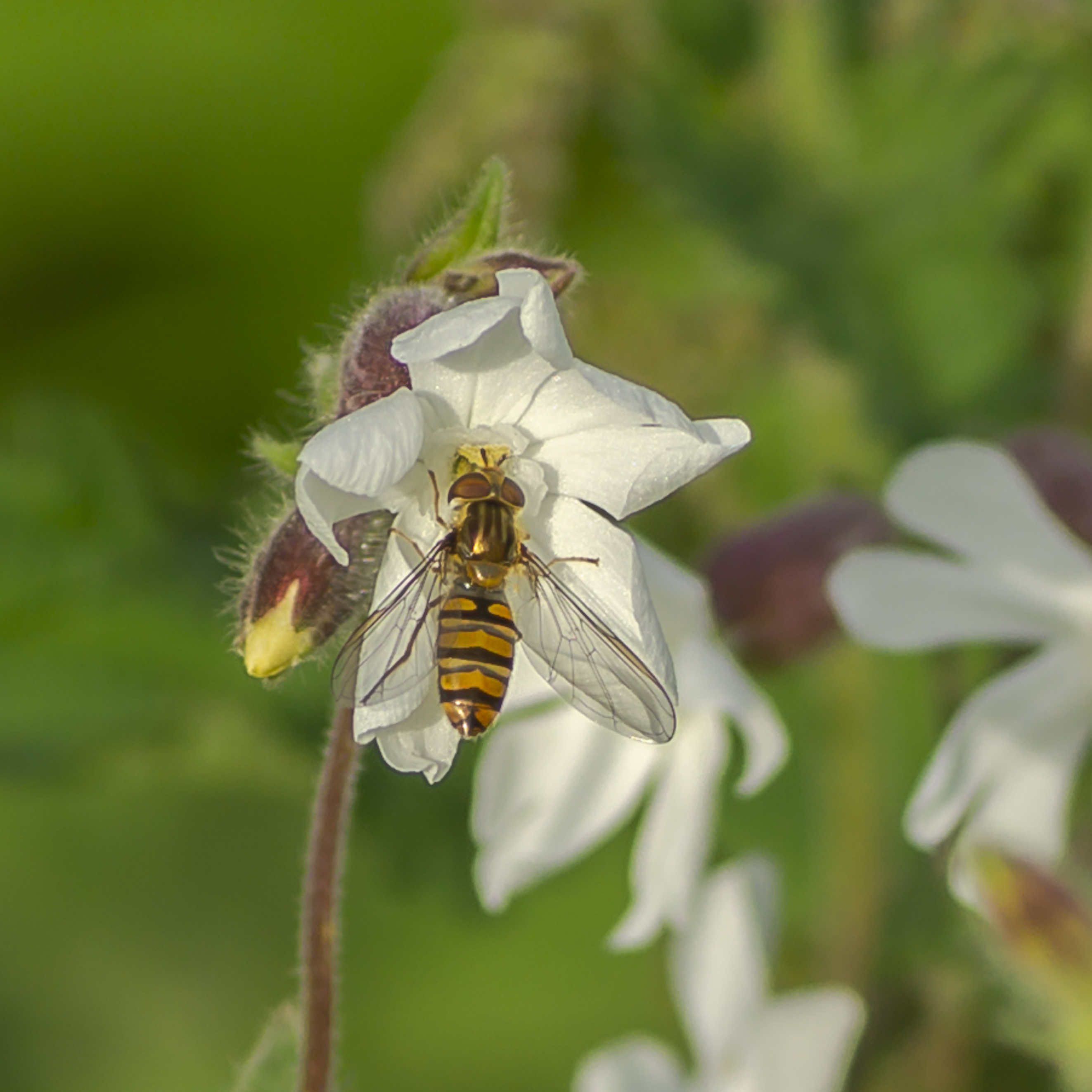 zweefvlieg op een witte bloem