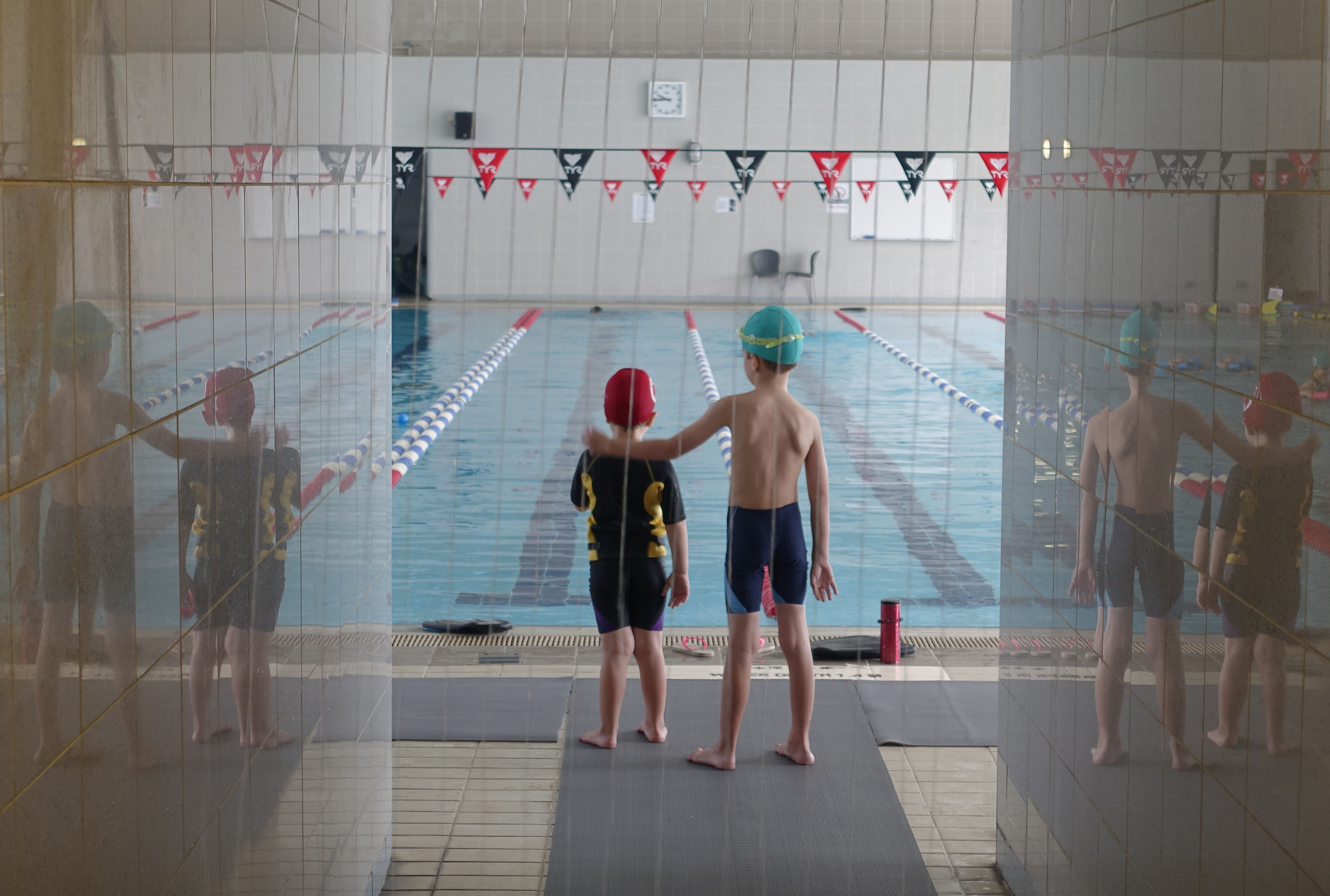 Kleinzonen staan klaar om aan hun zwemles te beginnen. Hong Kong 17-10-2015. Eigenlijk mag in het zwembad niet gefotografeerd worden. Haast gaat soms een beetje ten koste van de compositie.